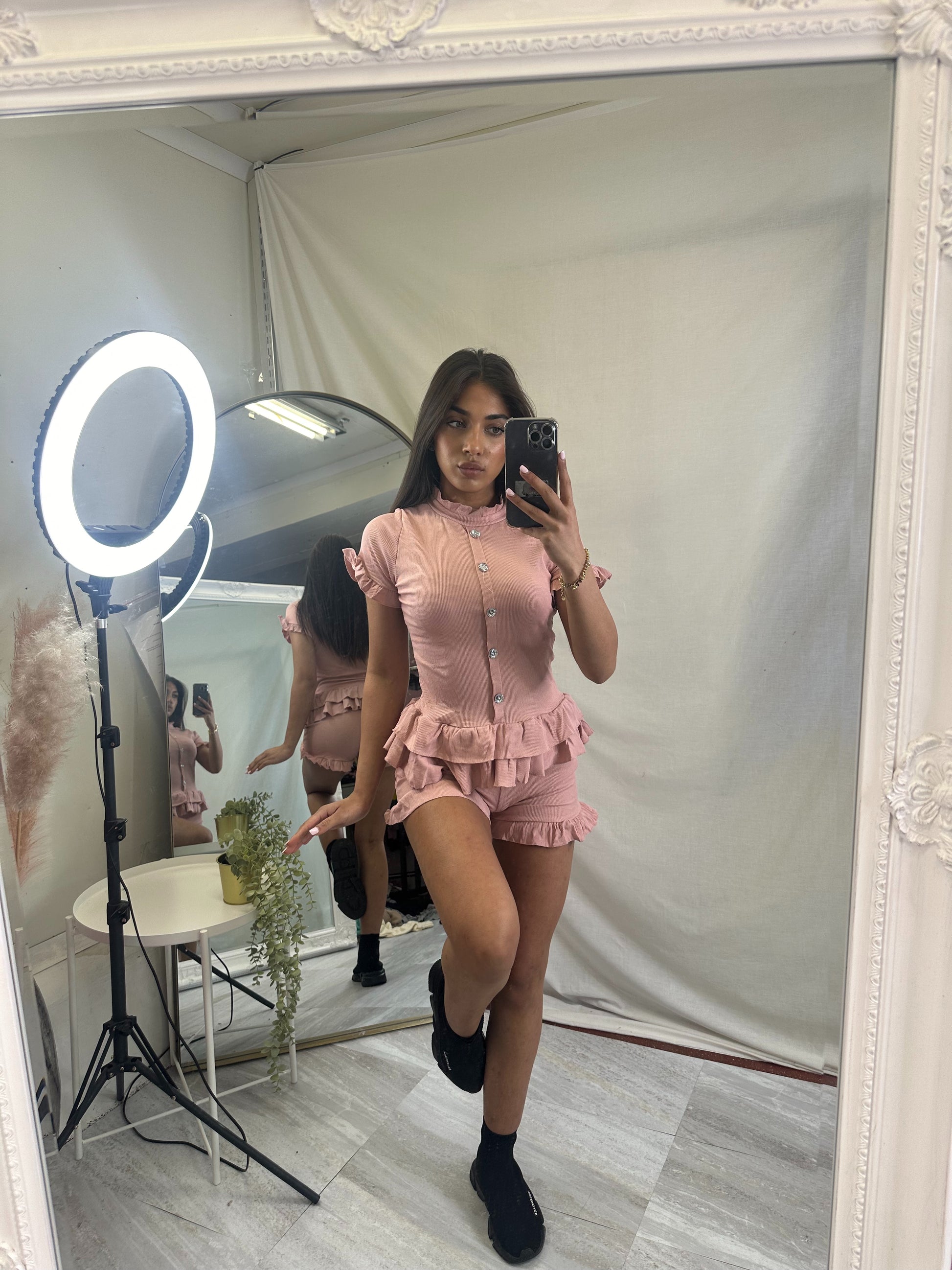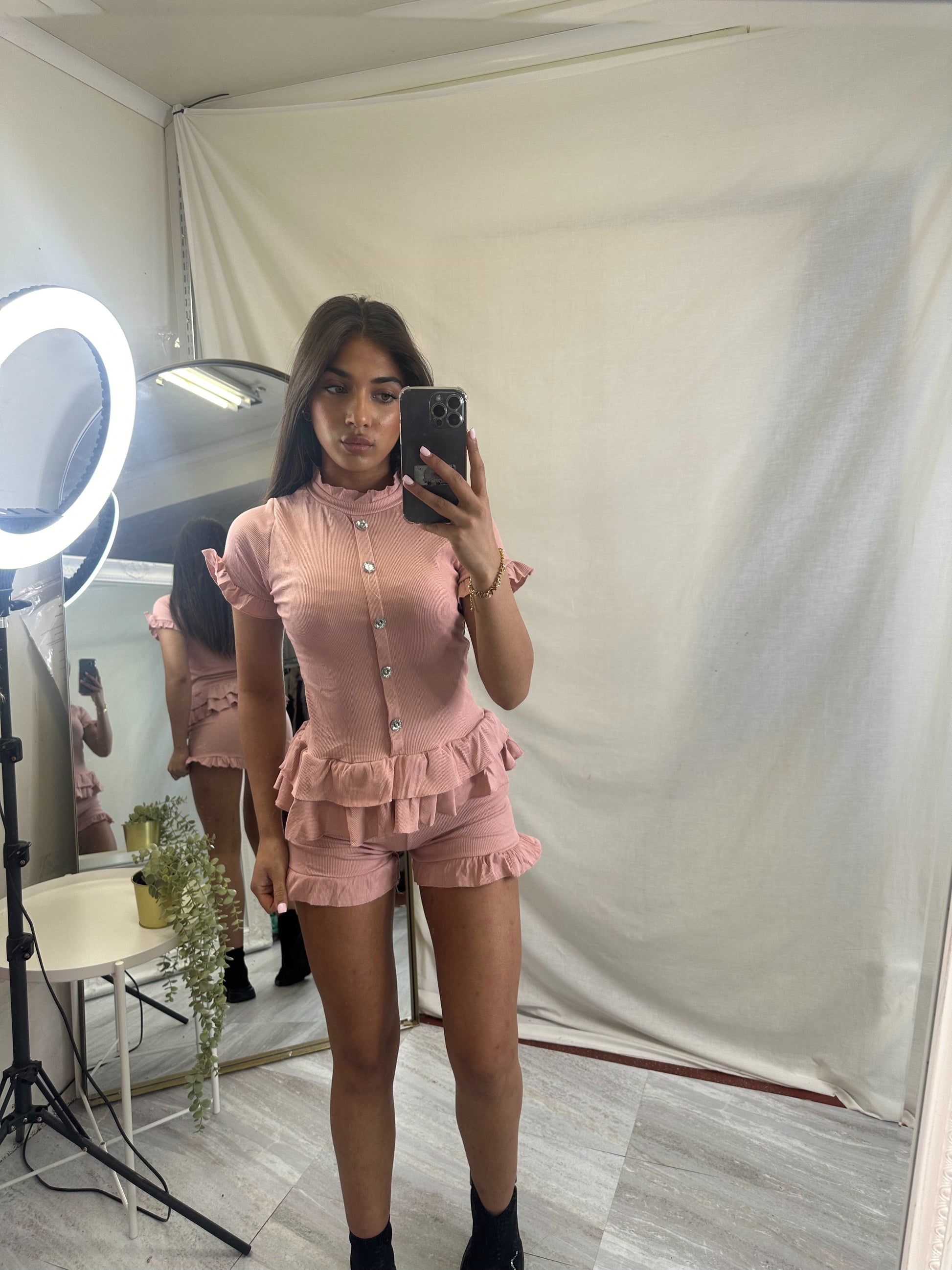 Amy ribbed peplum top and frilled hem shorts lounge wear set