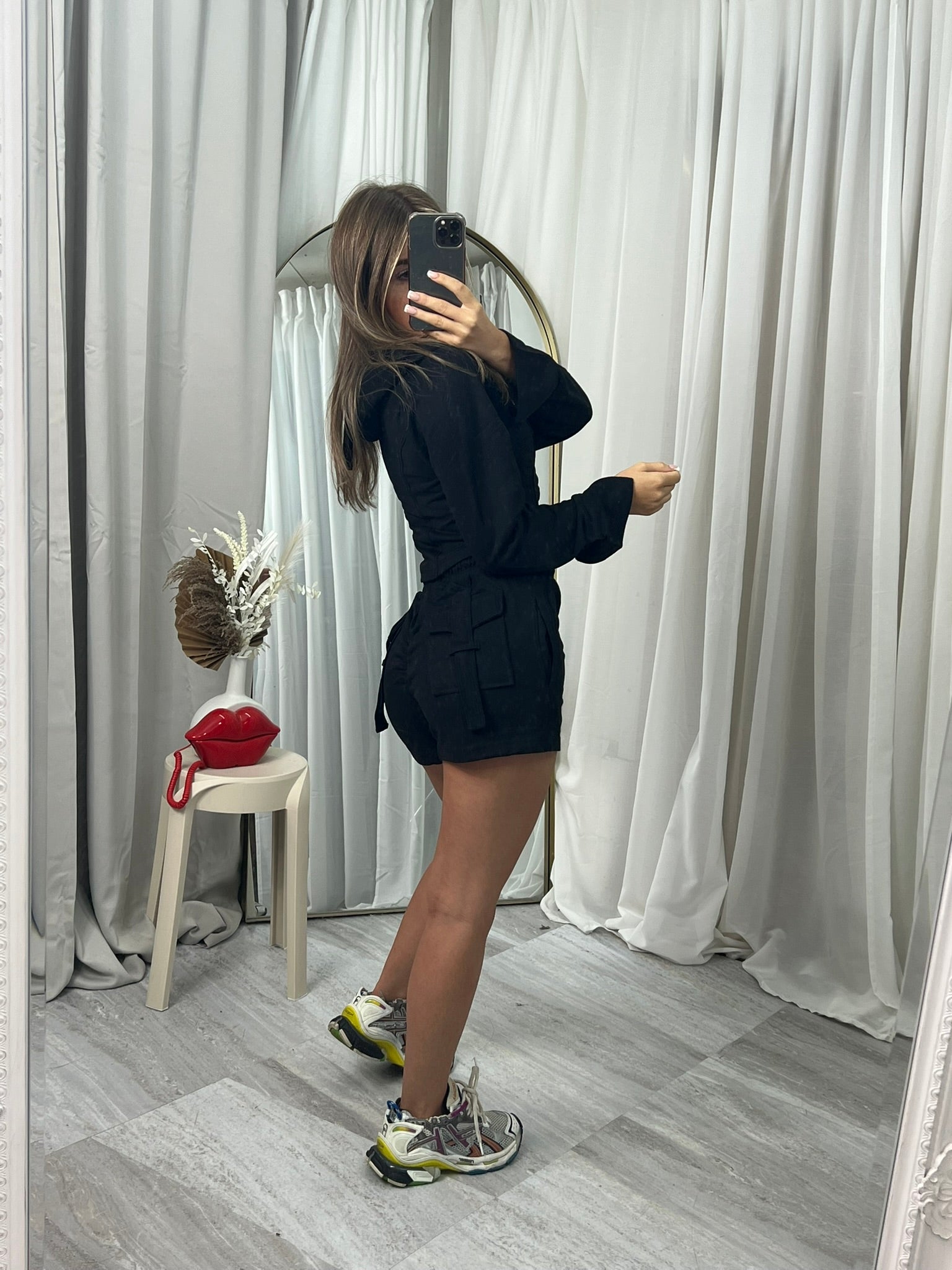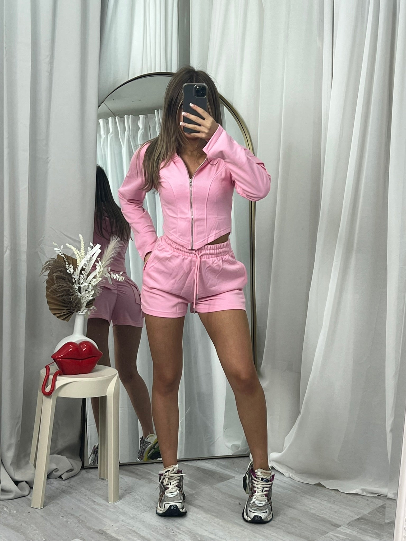 This set includes a long sleeve zip-up crop hoodie paired with matching shorts, designed with functional cargo...