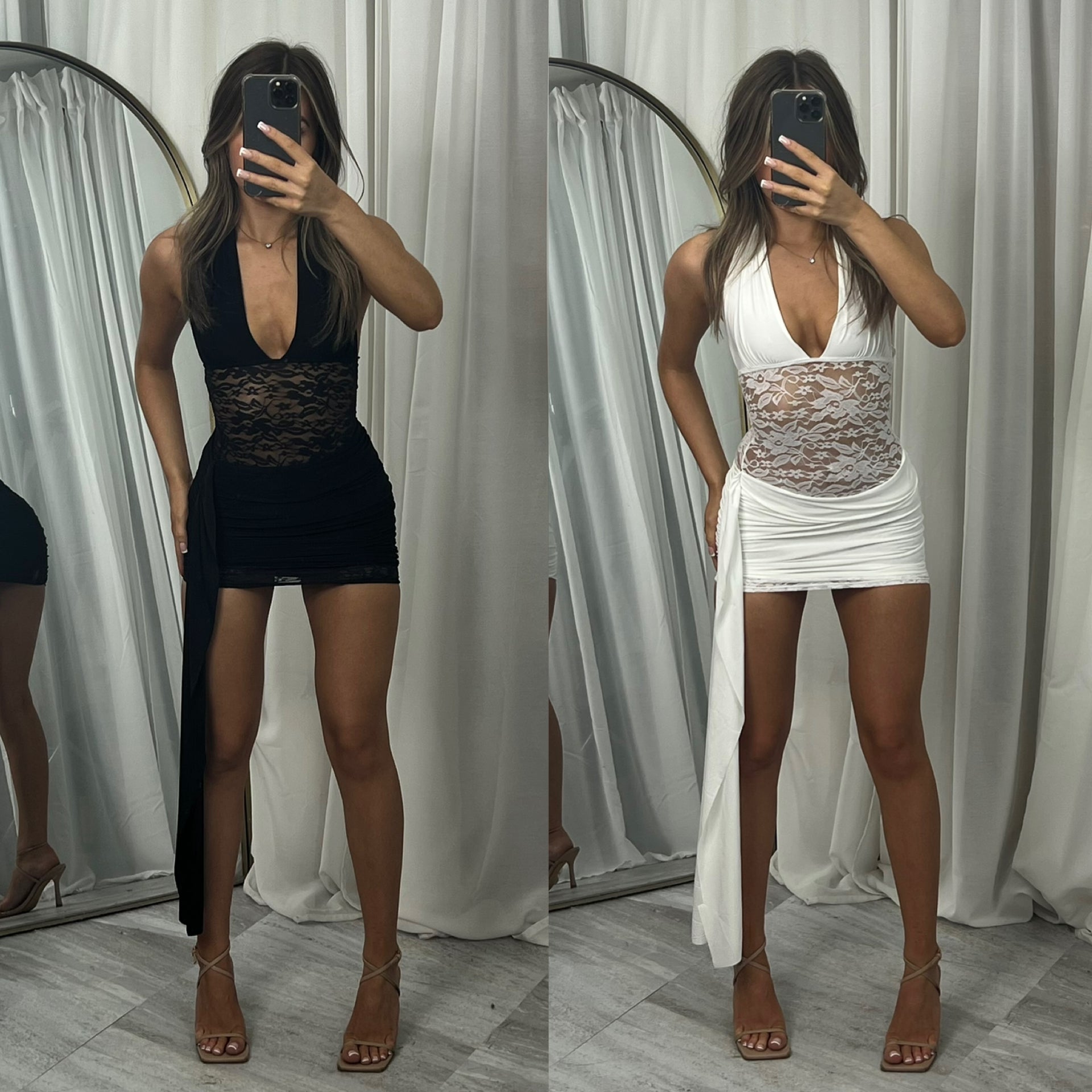 This draped detail lace mini dress combines delicate craftsmanship with a flattering silhouette. The intricate lace overlay...
