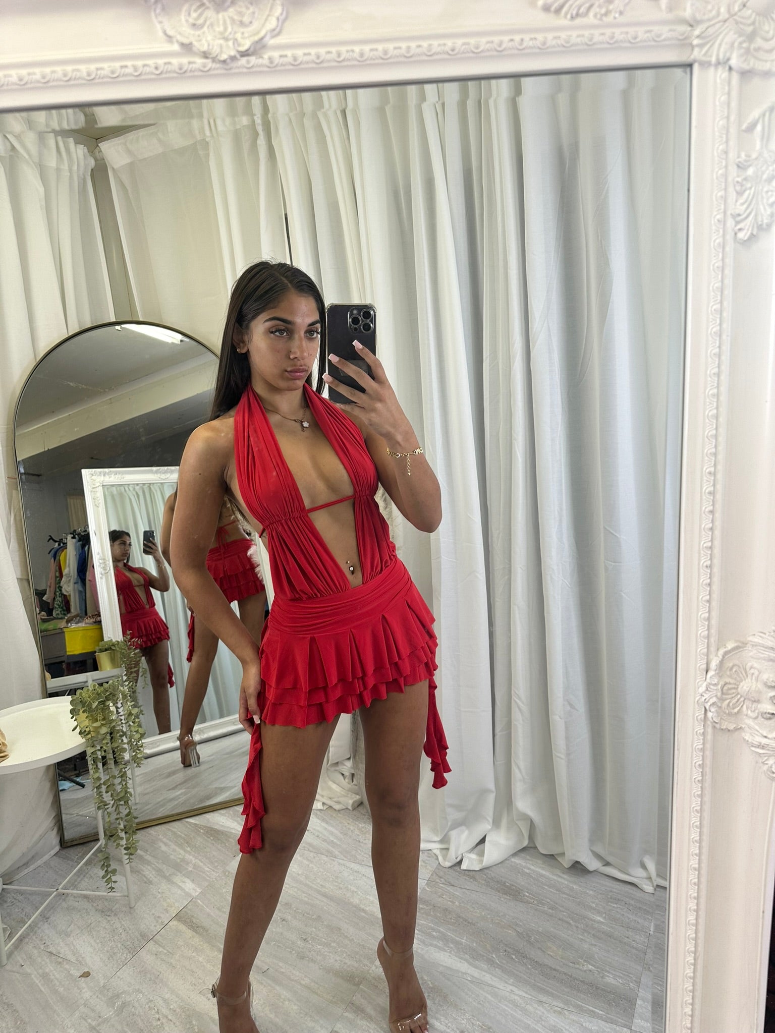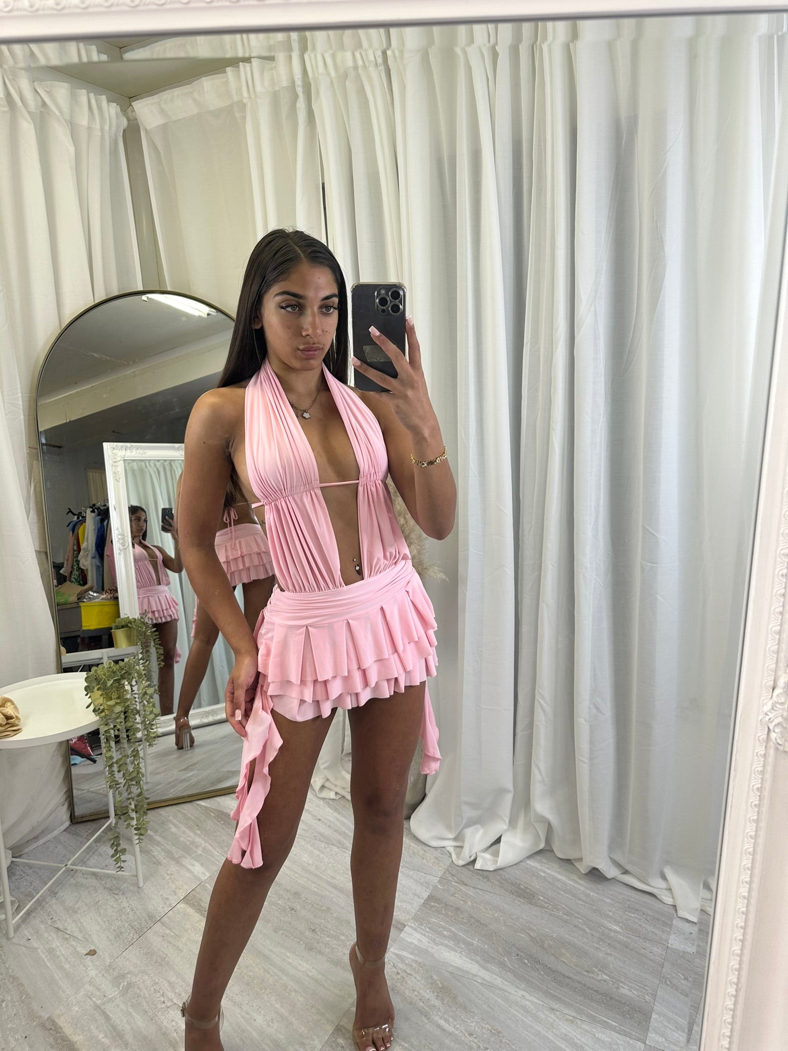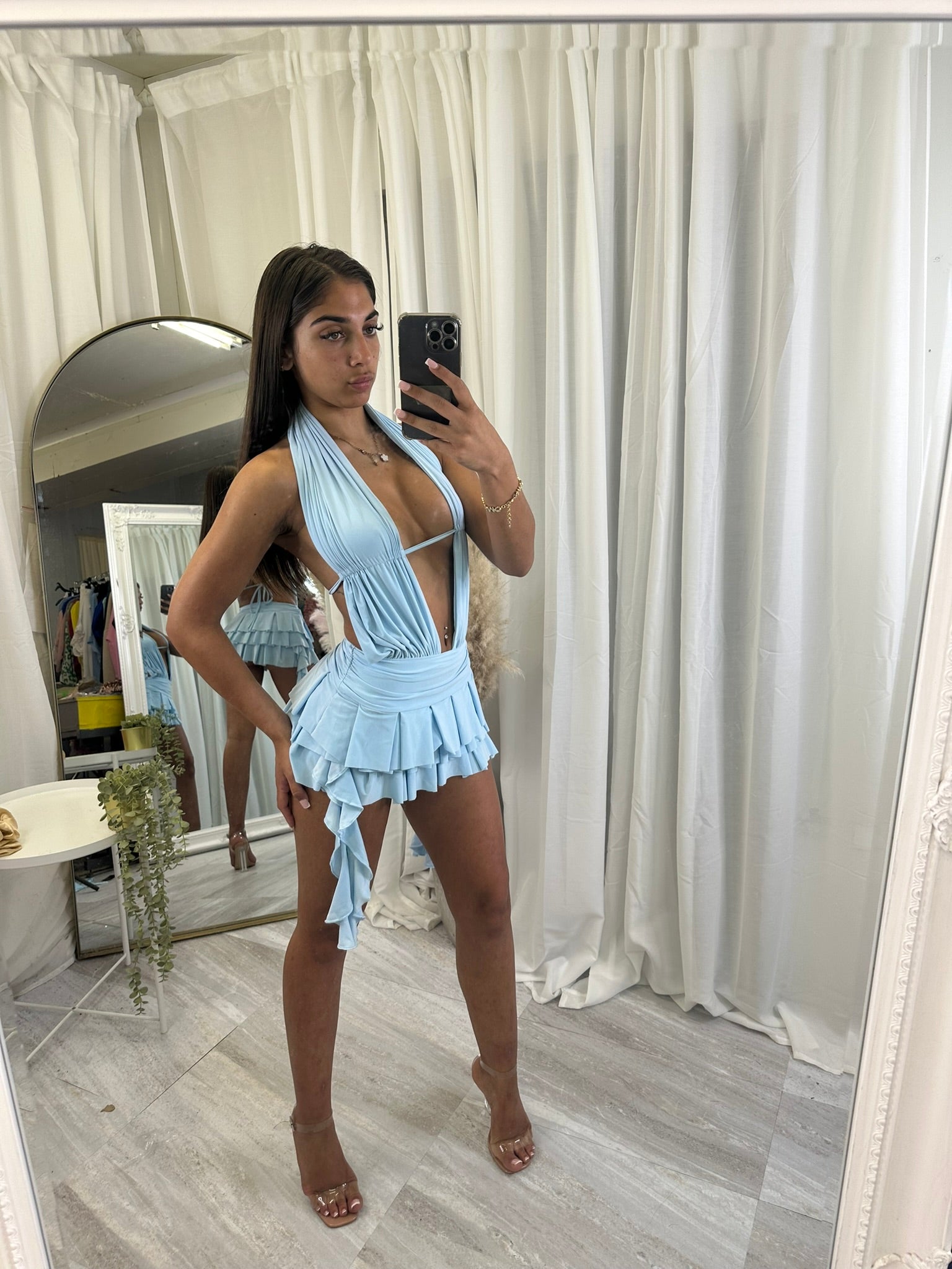 Long sleeved crop top and frill detail mini skirt party outfit