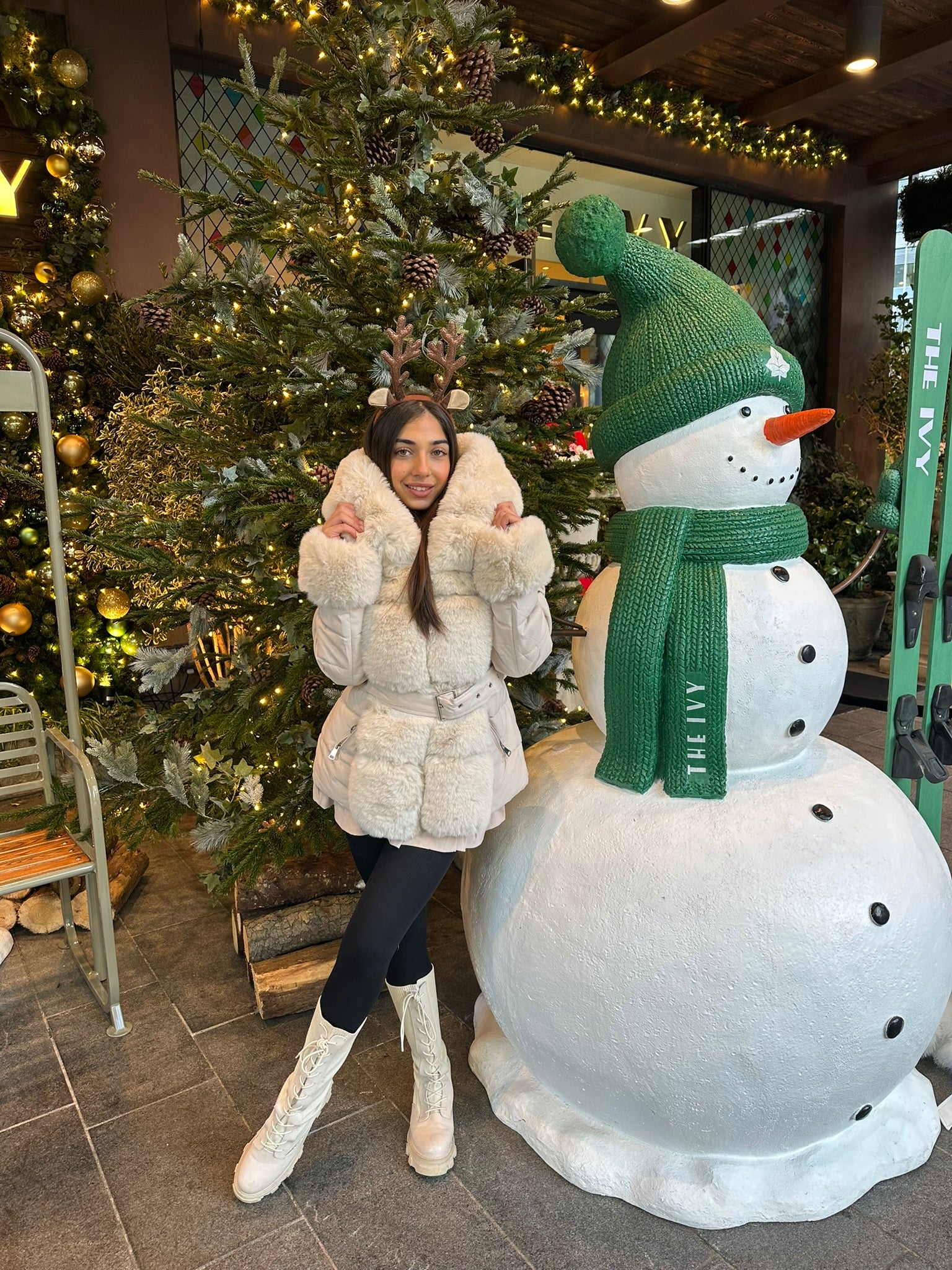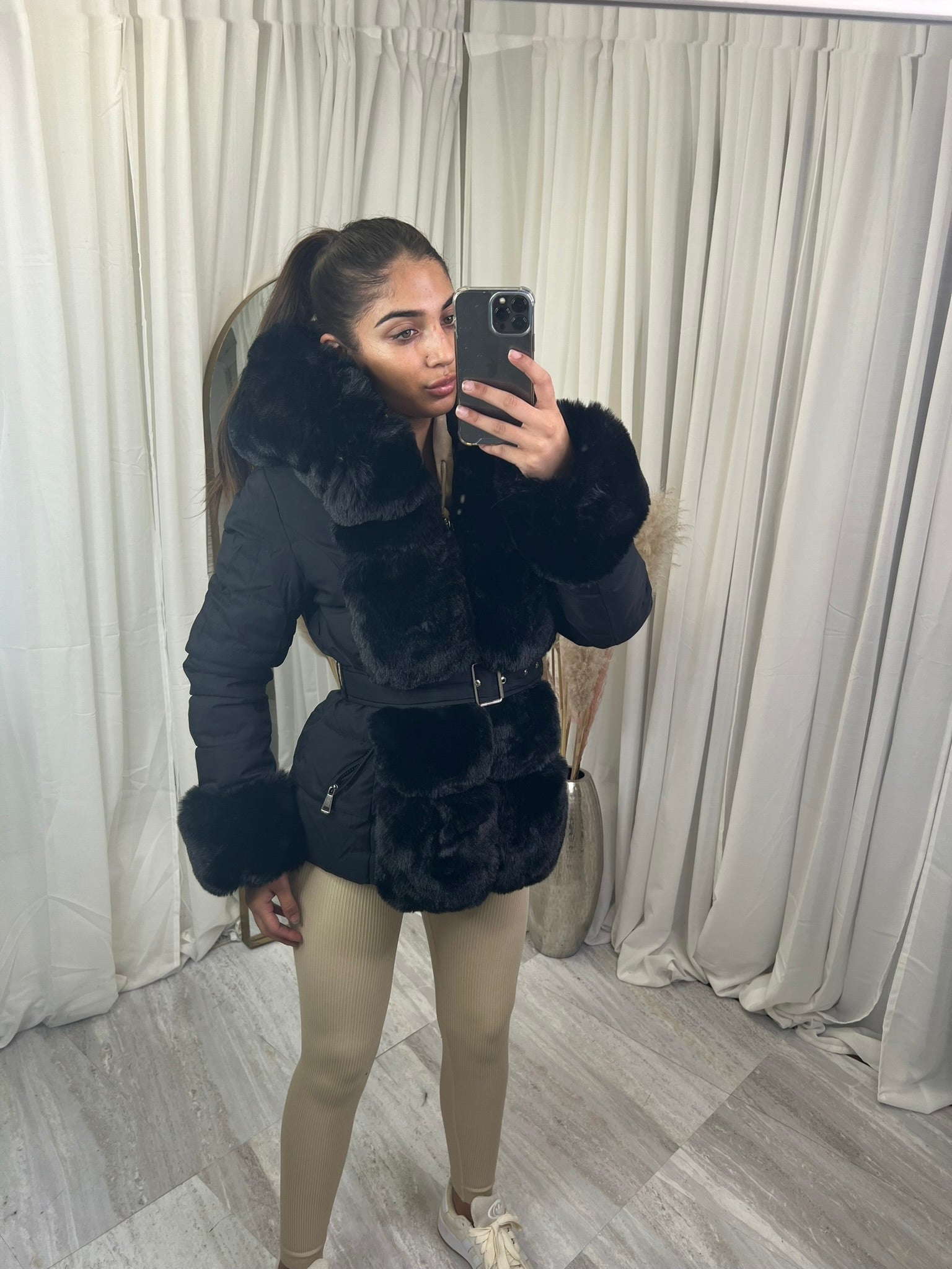 This belted puffer coat combines warmth and style with its plush fur collar and fur-trimmed cuffs. The...