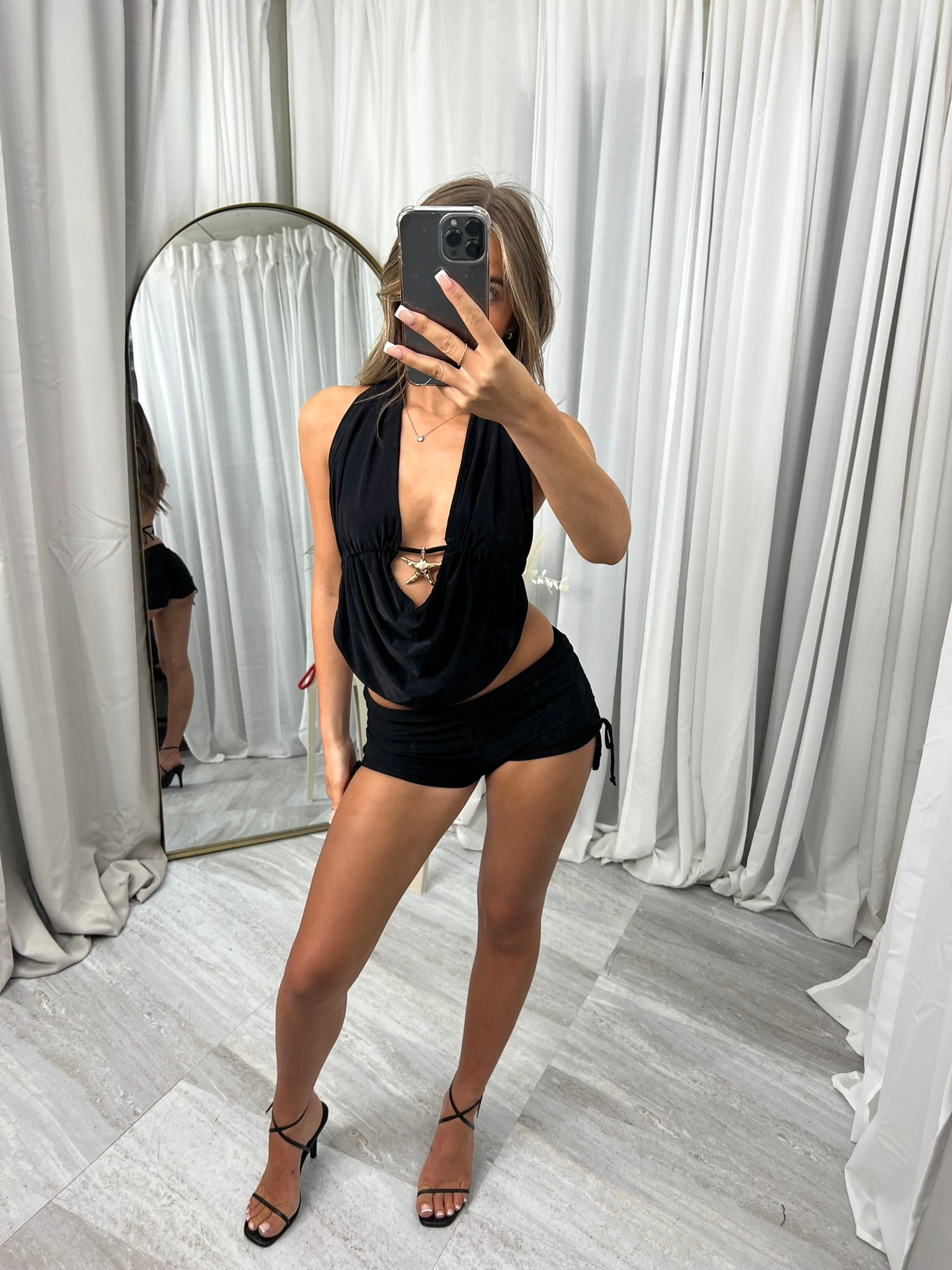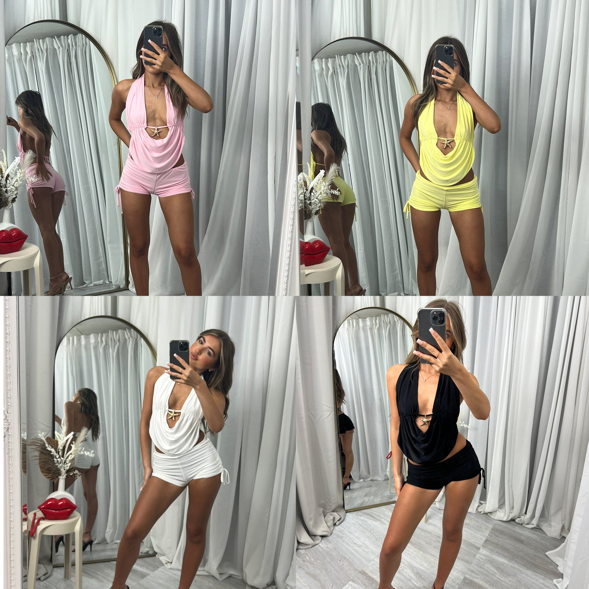 This halter neck shorts set features ruched sides that enhance the silhouette with subtle texture and shape....