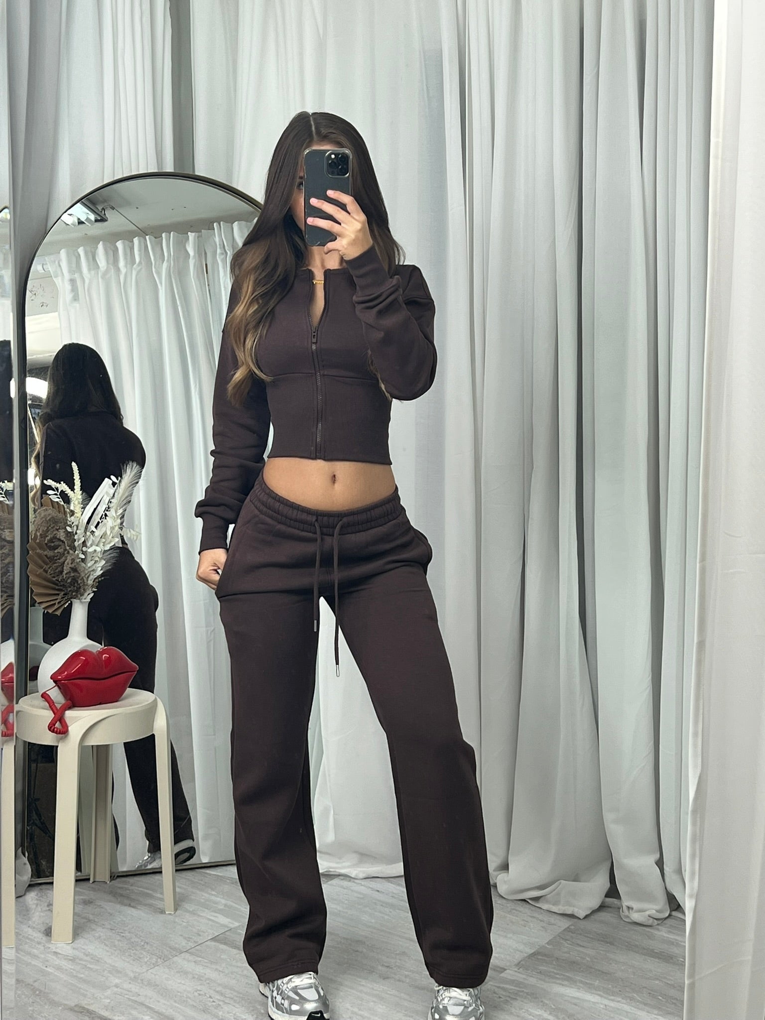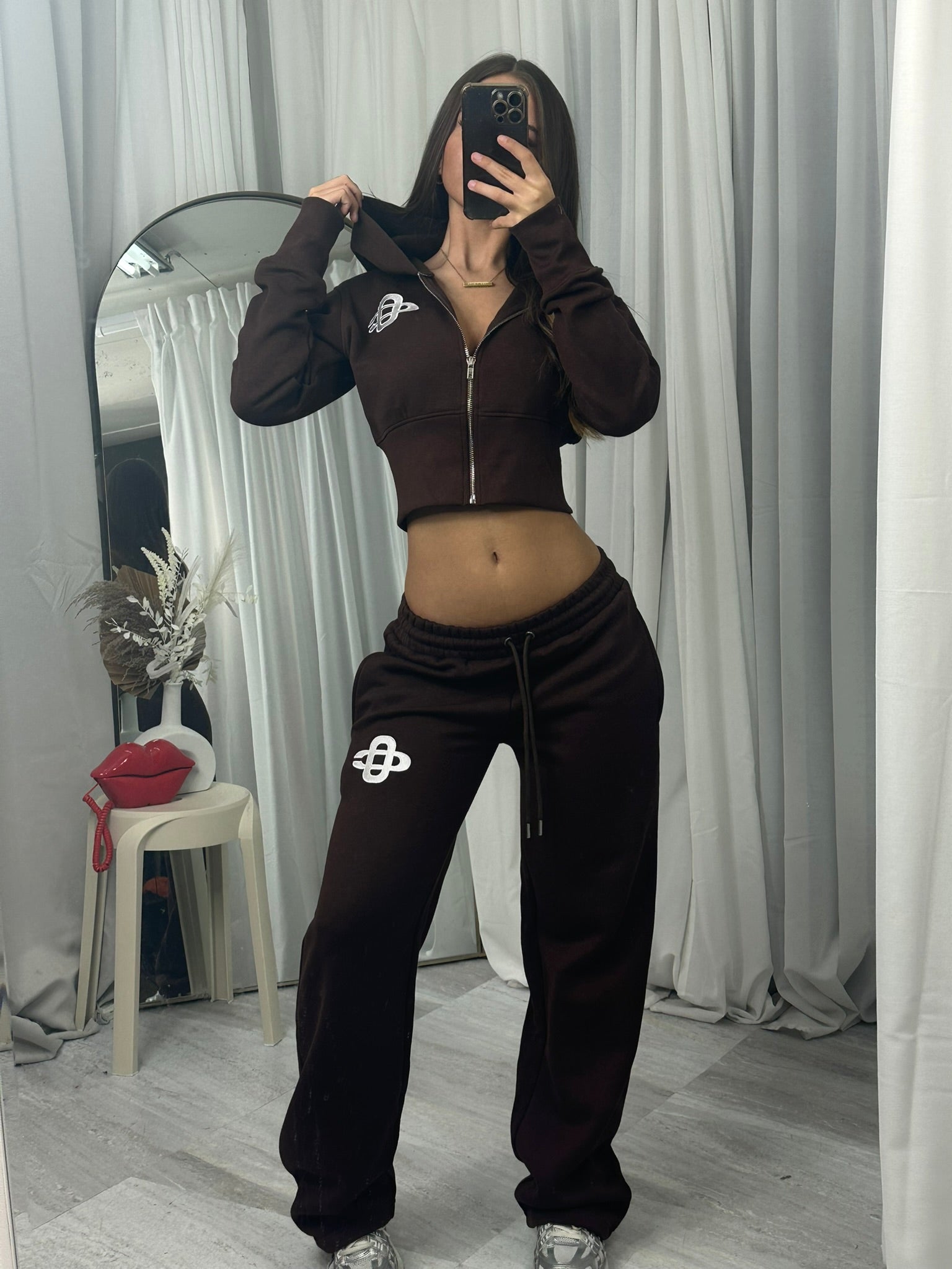 Elevate your casual wardrobe with this contemporary tracksuit set, featuring a structured hooded crop top paired with...