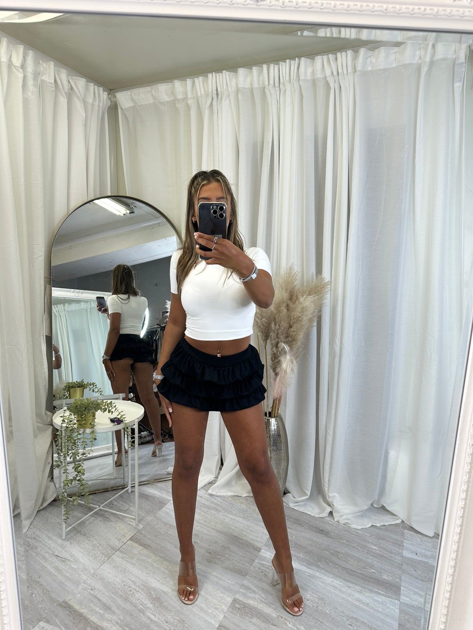 Long sleeved crop top and frill detail mini skirt party outfit
