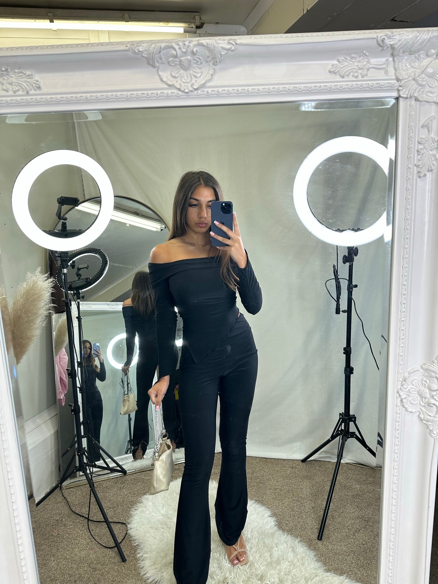 Long sleeved crop top and frill detail mini skirt party outfit