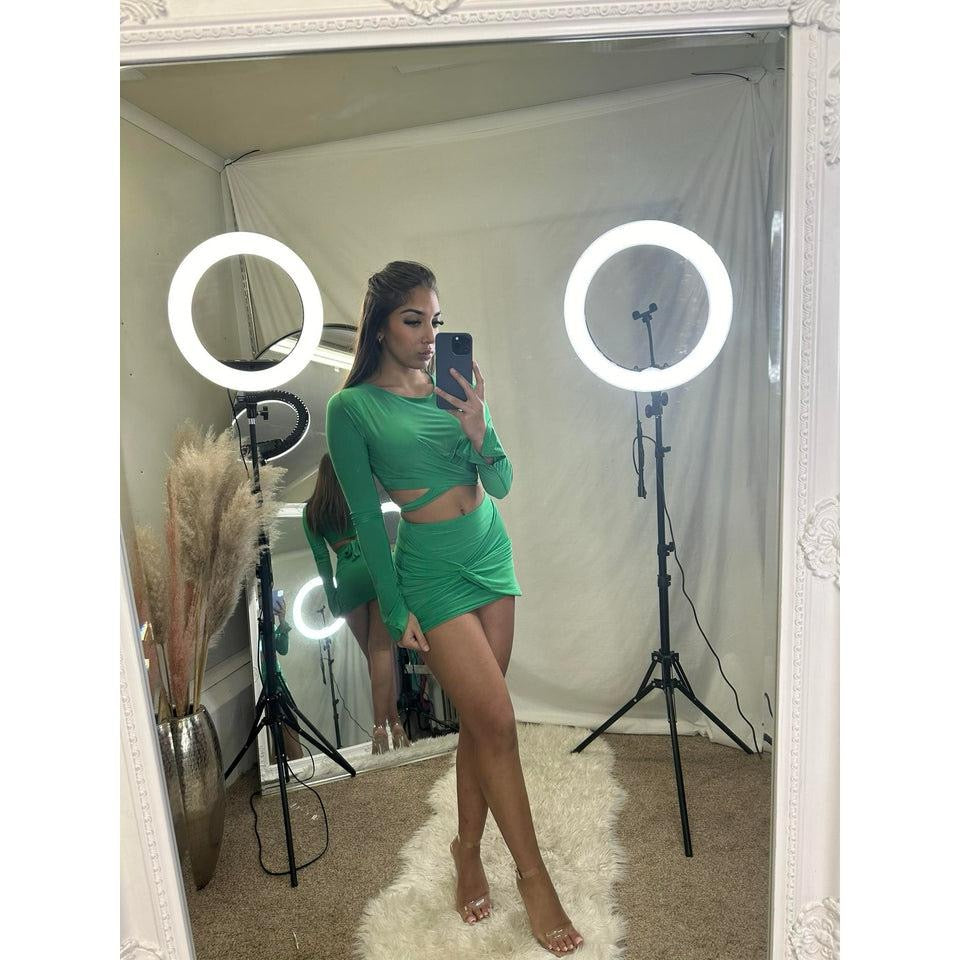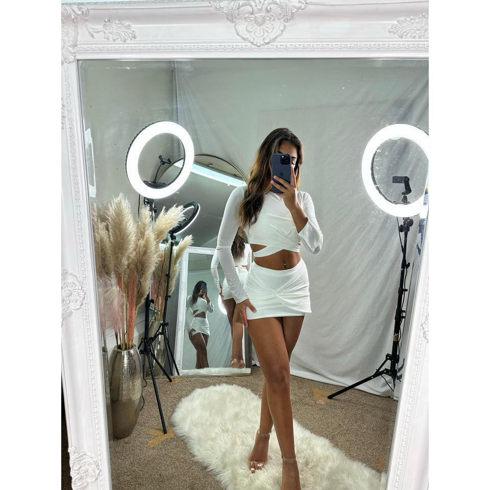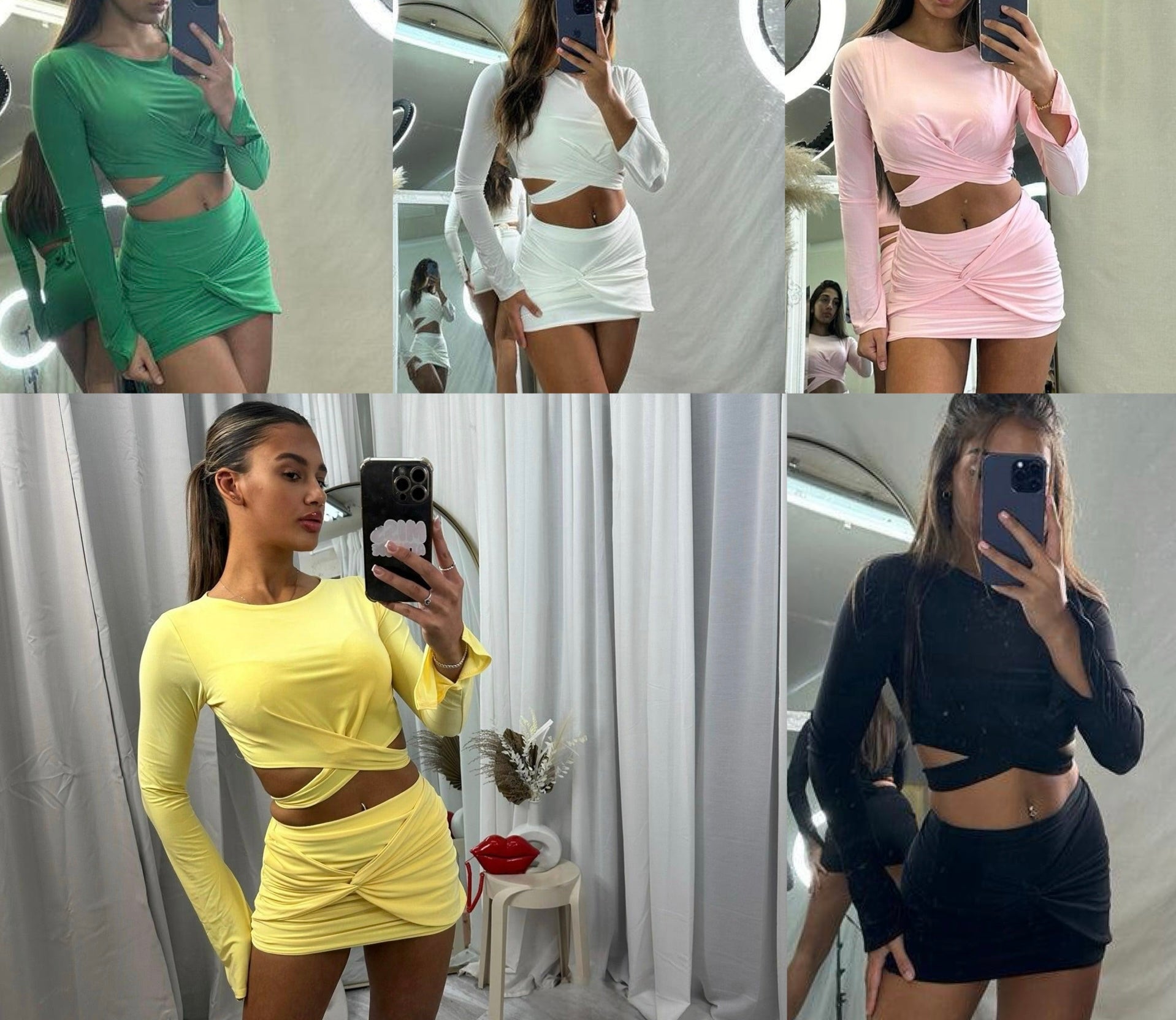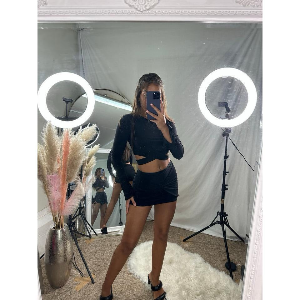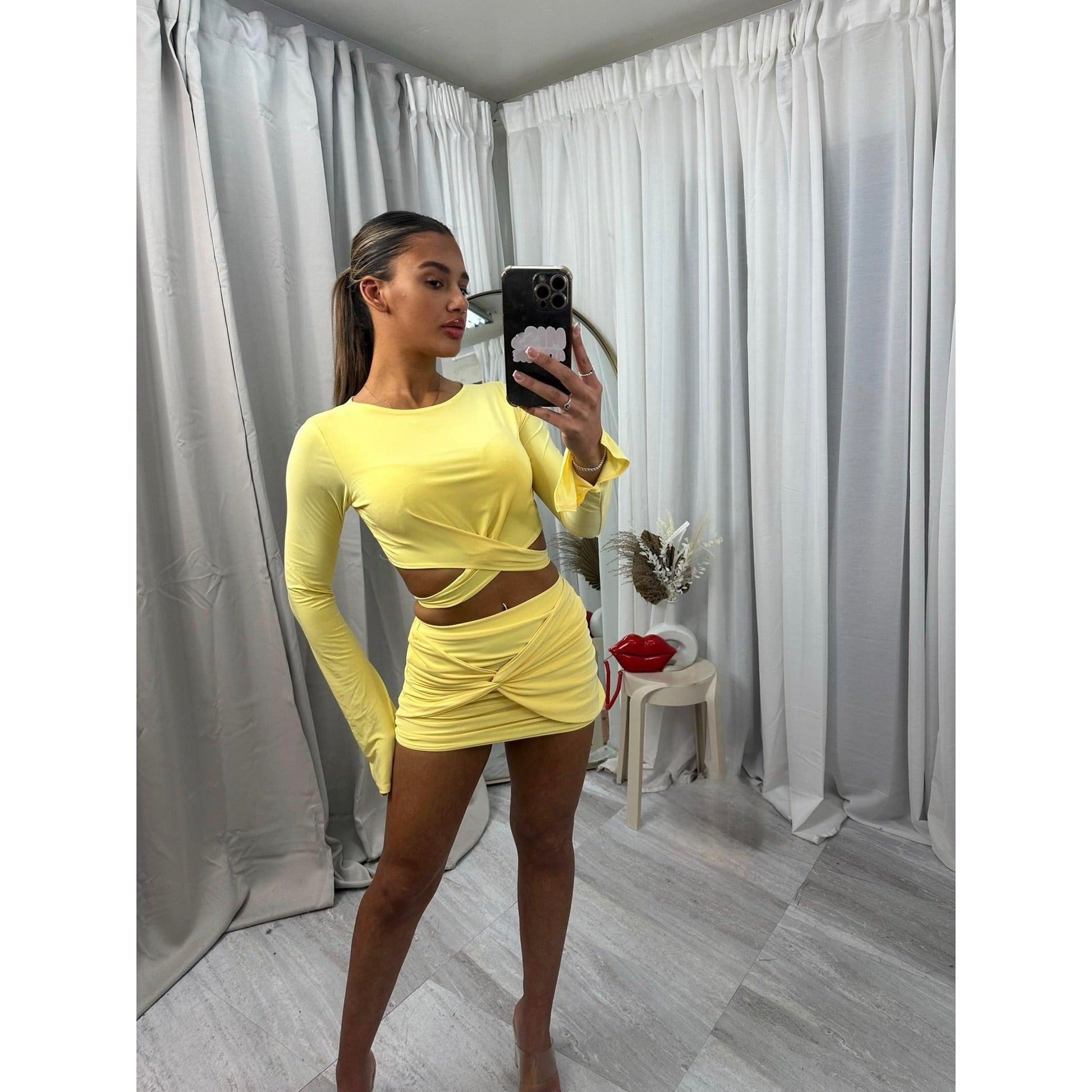 This stylish set includes a long sleeved crop top with a tie back design, paired with a...