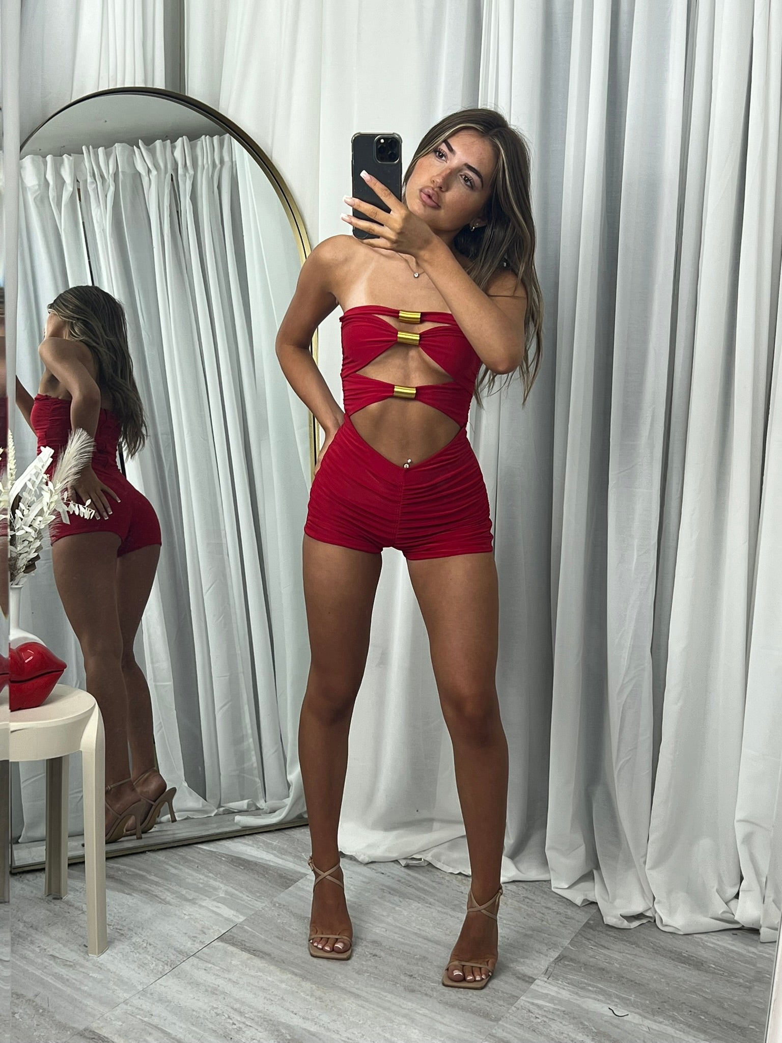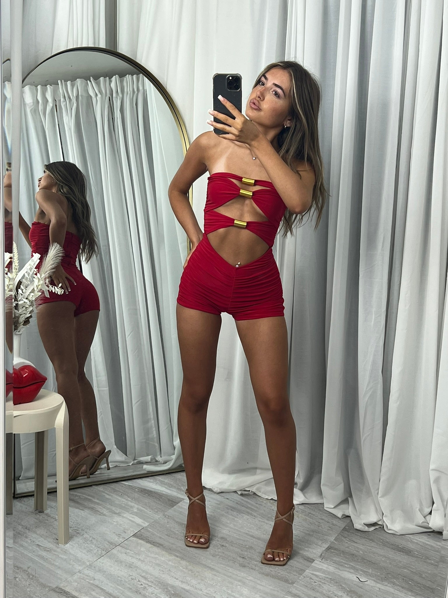 Long sleeved crop top and frill detail mini skirt party outfit